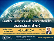 This section is a joint initiative SGP-IAPG. SGP-SEGCGS is the Peruvian section of the IAPG. SGP-SEGCGS/IAPG-Peru will start its activities with a presentation titled "Geoethics: the importance of democratizing the geosciences in Peru" by Juan Carlos Alejandro Piscoya Quevedo, Planning and Outreach Coordinator of IAPG-Peru. The specialized section on geoethics is the result of the 1st Colloquium on Geoethics in Peru organized by SGP and IAPG-Peru, held on 12 October 2015, in which Silvia Peppoloni (IAPG Secretary General) and Giuseppe Di Capua (IAPG Treasurer) gave speeches about geoethics and the IAPG network, and of the SGP meeting that took place on 29 January 2016. Congratulations to Sandra Villacorta, coordinator of IAPG-Peru, and to Eng. Carlos Monges Reyes, President of the SGP, for this important achievement.